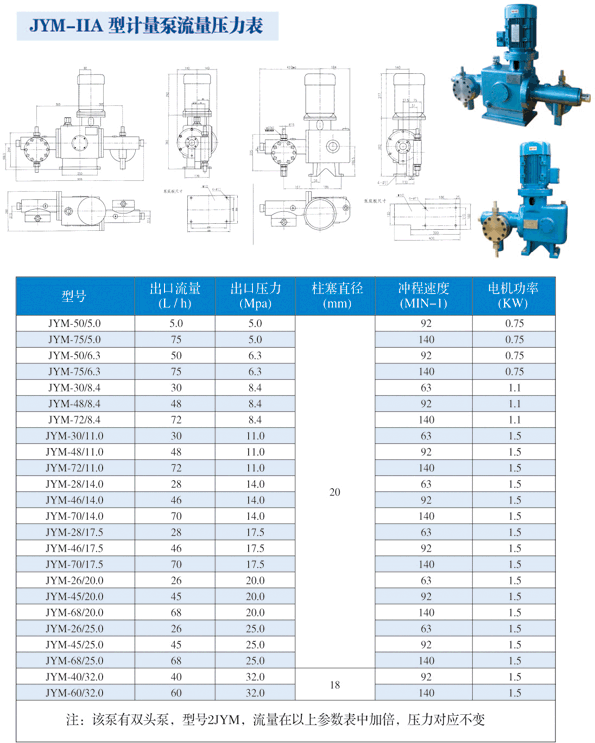 計量泵 >> JYM-ⅡA型計量泵 最大流量為140L/H,最高耐壓32Mpa